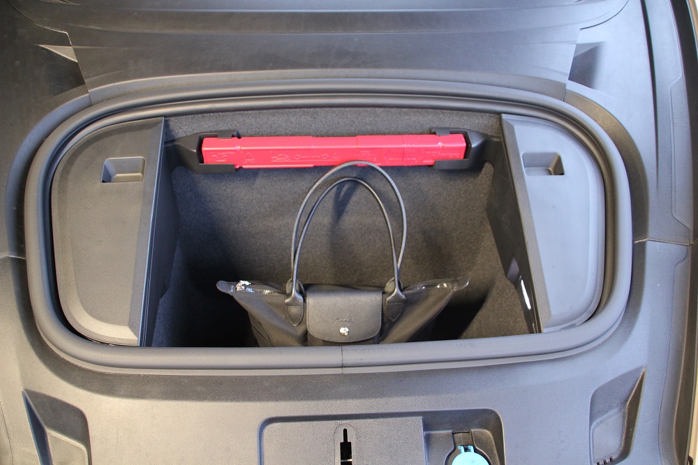 Další zavazadlový prostor je třeba hledat také pod kapotou, právě zde nachází přední kufr, tzn. frunk, o objemu 84 litrů. Ideální místo na nabíjecí kabely, v našem případě na střední shopping bag.